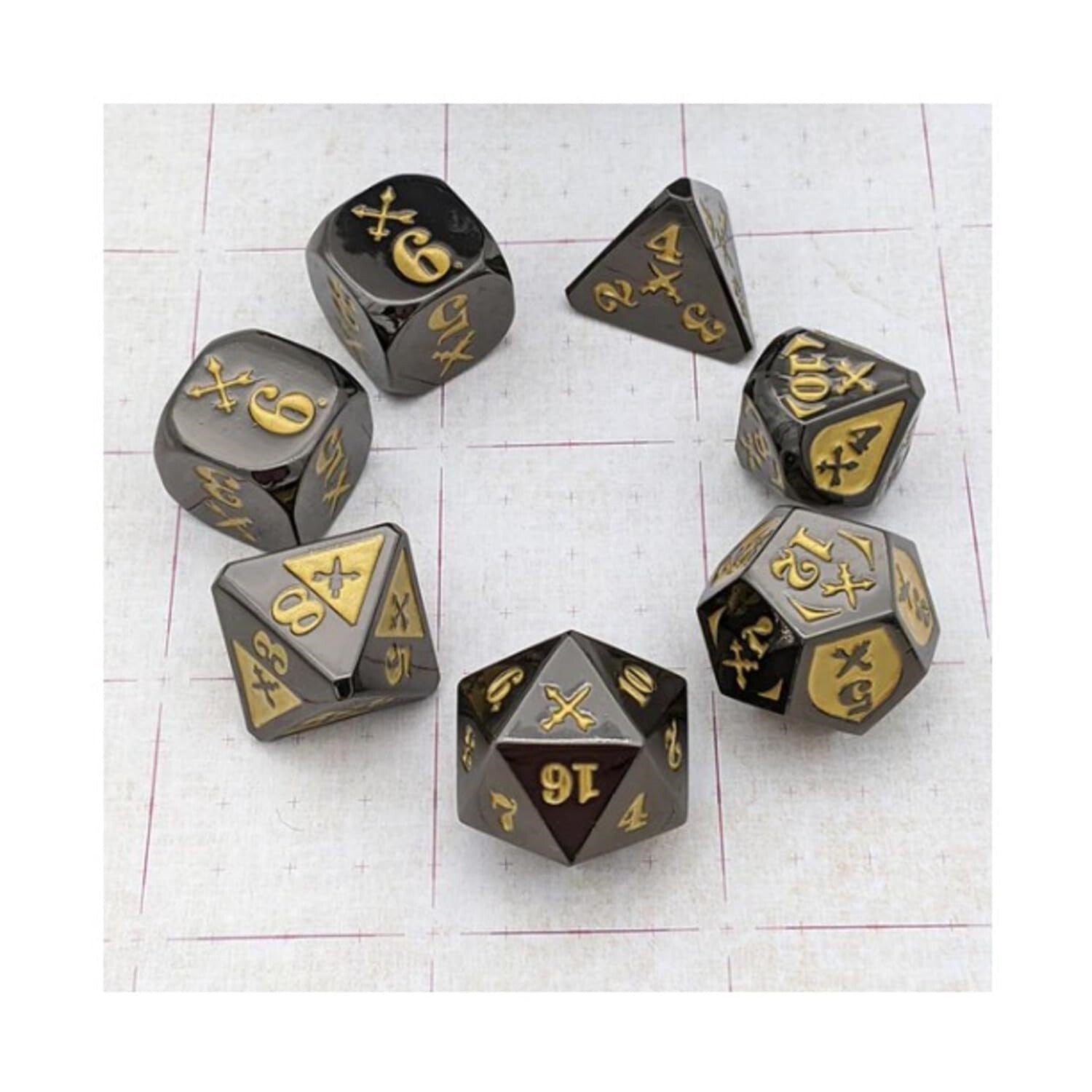 GYLD Polyhedral dice specifically designed, produced, and packaged for rolling Piercing damage in Dungeons and Dragons Fifth Edition. The base set of 7 dice can be used as your main set, or as a stylish supplement. The weight of this metal set delivers a satisfying roll for martial classes which don`t get the dice-waterfall damage rolls of magic users. Available in two colorways: Black & Silver and Black & Gold. Pick your favorite, or get one of each to roll your multi-attacks all at once and know which d20 goes with which damage die. Additional pairs of dice are available as well, if you need to pick up an extra d20 for attacking recklessly or sneakily.